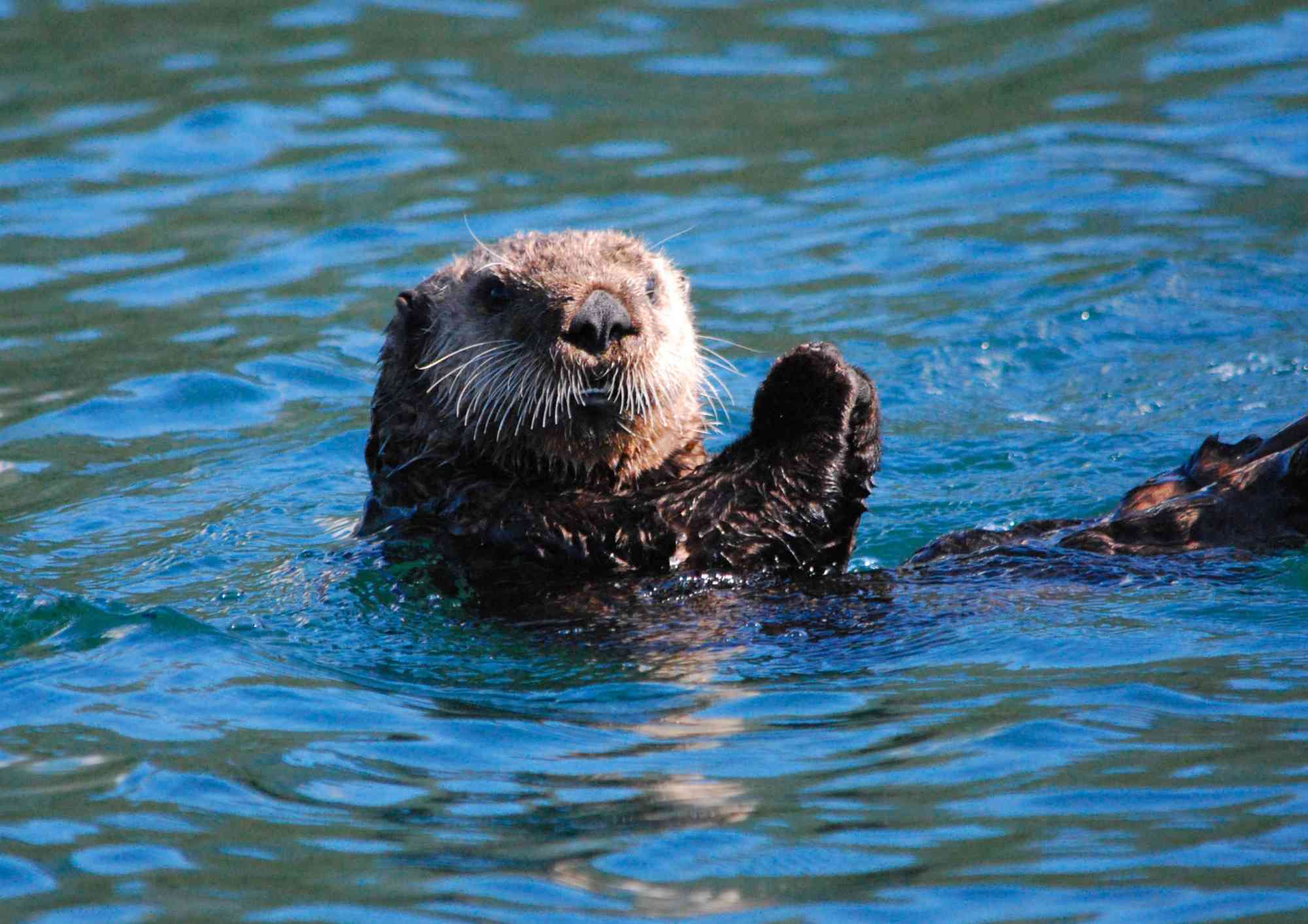 Sea otters are the only mustelid in the genus Enhydra, and they are significantly different from all other mustelids. Sea otters are one of nine to thirteen (taxonomists disagree on the exact number) species of otters found around the world. Except for sea otters and the endangered species of marine otters, all other otters live primarily in freshwater, although river otters (Lutra canadensis) travel freely between rivers and the ocean, and on Kodiak, it is common to see river otters swimming near shore in the ocean. River otters and sea otters resemble each other, but sea otters are larger and weigh two to three times more than river otters. Sea otters have adapted to a life in the ocean with hind feet that are webbed to the tips of their toes and resemble flippers. River otters also have webbed feet, but they are small, making it easier for river otters to move on land, while sea otters are very clumsy out of water. A sea otter’s tail is flat and looks like a paddle, while a river otter has a long, round tail that tapers to a point. The claws in the forepaws of a sea otter can be extended, but those of a river otter cannot. River otters swim on their stomachs, and although sea otters can also swim on their stomachs, they usually swim on their backs while paddling with their hind flippers. River otters give birth to litters of up to four pups, but sea otters, like other marine mammals, usually only give birth to a single pup.
