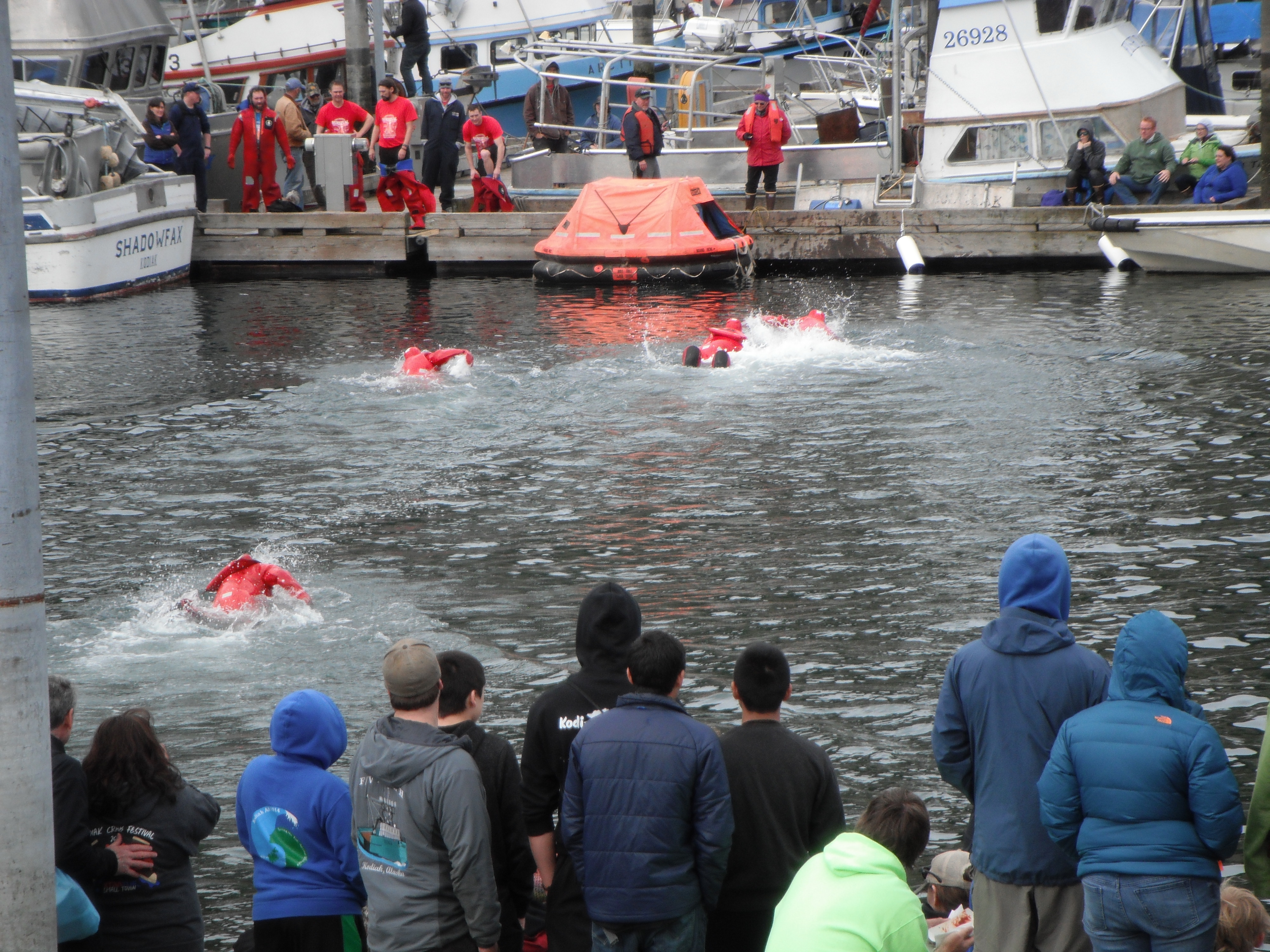 The King Crab Festival is Kodiak’s version of the county fair but with some uniquely “Kodiak” twists. Since it is difficult and expensive to bring carnival rides to the island, most of the “rides” are of the inflatable variety, but the kids are no-less enthusiastic about them. Many of the food booths are operated by local vendors, and you can dine on salmon, halibut, cod, and of course King Crab, among other things. There is no tractor pull at the King Crab Festival, but the Coast Guard demonstrates simulated rescues, a Russian Orthodox priest blesses the fishing fleet, and most popular of all, festival-goers line the boat ramp near the harbor and cheer on the participants in the survival-suit race. For this activity, teams of four race down a ramp, pull on and zip up bulky survival suits, then jump into the water and swim to a life raft. Once all four team members are in the raft, the clock stops and their time is recorded. The team with the fastest time wins. Participants include everyone from families to fishing vessel crew members to Coast Guard rescue swimmers. The rescue swimmers usually win, but no one complains about that. We want those guys to be fast!